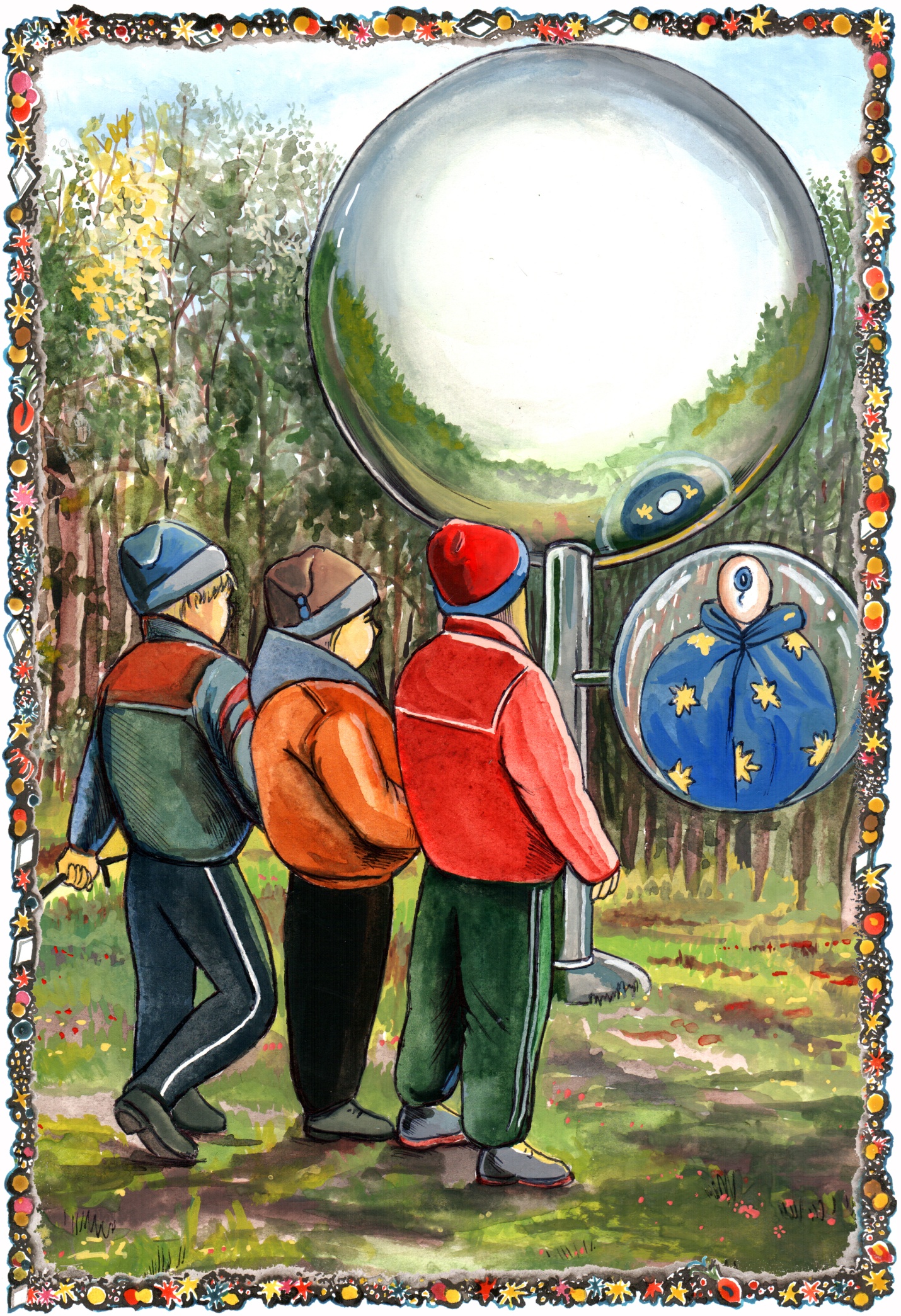 Никаких приборов и кнопочек, как ожидали малыши, они не увидели. Труба под шаром свернулась, капля поднялась с земли и прилипла к полу под малышами. Земля же в этот момент стала плавно удаляться. Вот из-за деревьев Донесители разглядели свой автомобиль и родителей, которые бегали по берегу, разыскивая своих детей.