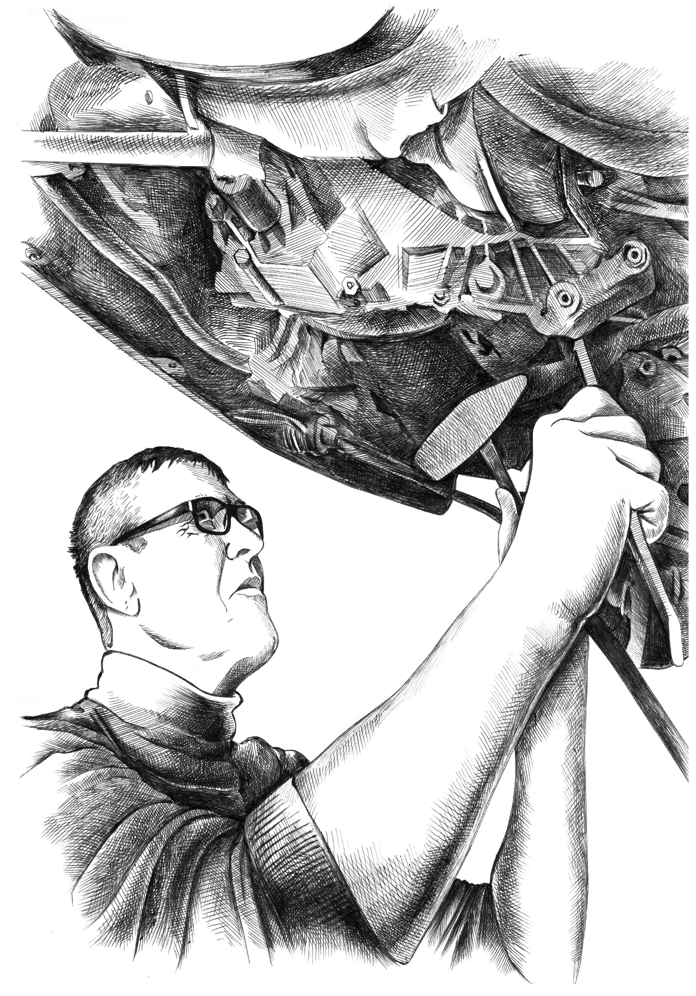 Мастер установил штанги подъемника и поднял машину на уровень своего роста. Его жилистые руки работают, будто на автомате. Почти не думая, не совершая лишних шагов, без суеты, человек в робе подгоняет гидравлическую подпорку под защиту картера. Три движения ногой и педаль вытягивает штырь в нужное место. Гайки и болты поэтапно откручиваются и складываются по порядку на балке подъемника. Так, как тысячи раз до этого момента, с тысячей чужих машин.