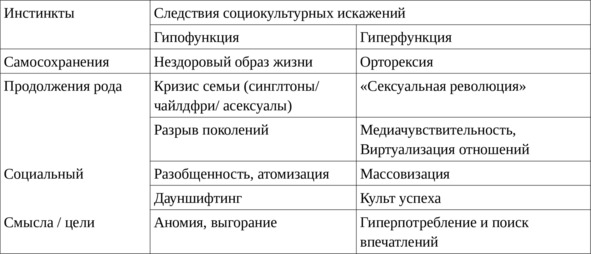 Таблица 1. Социокультурные искажения инстинктивно детерминированных ценностей