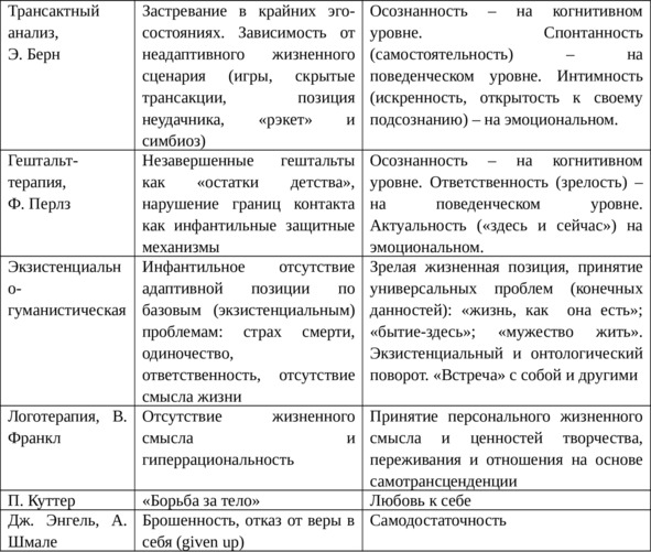 Нетрудно видеть, что в качестве причин возникновения психологических проблем и механизмов их формирования все перечисленные классические методы психотерапии указывают инфантильность, но рассматривают ее фрагментарно, в отдельных проявлениях. Среди последних инфантильные механизмы мышления (когнитивная психотерапия) и речи (НЛП), поведения (поведенческая психотерапия), психологических защит (психоанализ), отношения к себе и окружающим (гештальт, трансактный анализ, клиент-центрированная терапия), к жизни в целом (в экзистенциальном аспекте).