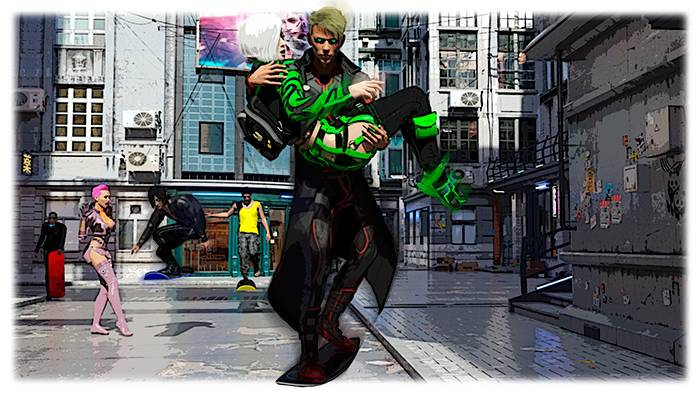Это был самый низкий парень – даже чуть ниже меня – в синих штанах, жёлтой безрукавке и шапке. В руке он держал чёрную доску, метр-двести в длину, с жёлтыми элементами корпуса. Второй был одет в черные штаны и куртку на голое тело, а из-под чёлки темных волос пробивалось голубое свечение глазных имплантов. Доска у него была черно-голубая, той же фирмы, что и у первого.