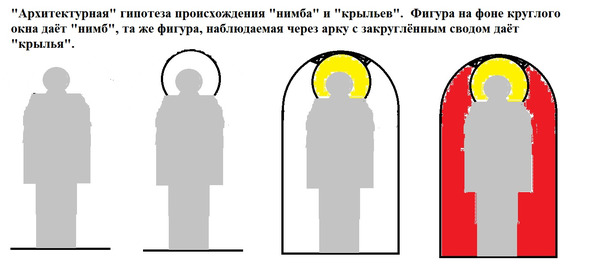 Графическое доказательство «архитектурной» гипотезы происхождения нимба святых и крыльев ангелов, так часто изображаемых на христианских иконах, от наложения элементов храмов на фигуру человека; автор: С. Е. Сметанин