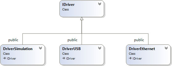 От общего интерфейса наследуются классы, реализующие драйверы различных типов. В нашей системе реализованы три типа драйверов: драйвер для работы с шиной USB; драйвер для работы через сеть Ethernet; имитируемый драйвер. Диаграмма классов изображена на Рис. 28.
