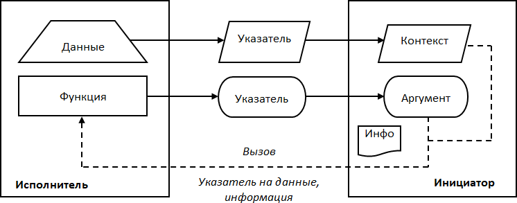 Графическое изображение реализации обратного вызова с помощью указателя на функцию представлено на Рис. 10. Исполнитель реализован в виде глобальной функции, в качестве контекста могут выступать любые данные. При настройке указатель на функцию как аргумент и указатель на данные как контекст сохраняются в инициаторе. Инициатор осуществляет обратный вызов посредством вызова функции через сохраненный указатель, передавая ей требуемые значения и контекст – указатель на данные. Поскольку инициатор не интерпретирует контекст и не выполняет с ним никаких операций, для хранения контекста используется нетипизированный указатель.