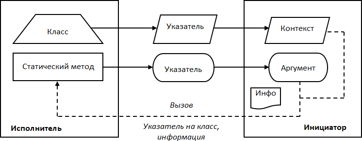 Графическое изображение обратного вызова с помощью указателя на статический метод класса представлено на Рис. 11. Исполнитель реализуется в виде класса, код упаковывается в статический метод класса, в качестве контекста выступает указатель на экземпляр класса. При настройке указатель на статический метод как аргумент и указатель на класс как контекст сохраняются в инициаторе. Инициатор осуществляет обратный вызов посредством вызова метода, передавая ему требуемую информацию и контекст – указатель на класс.
