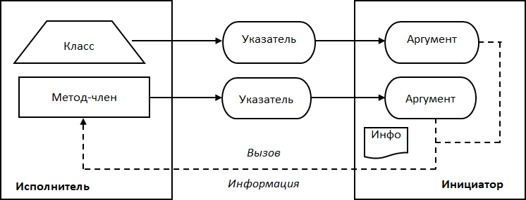 Графическое изображение обратного вызова с помощью указателя на метод-член класса (далее – метод класса) представлено на Рис. 12. Исполнитель реализуется в виде класса, код упаковывается в метод класса, в качестве контекста выступает экземпляр класса. При настройке указатель на метод и указатель на класс как как аргументы сохраняются в инициаторе. Инициатор осуществляет обратный вызов посредством вызова метода, передавая ему требуемую информацию. Контекст здесь передавать не нужно, поскольку внутри метода доступно все содержимое класса.