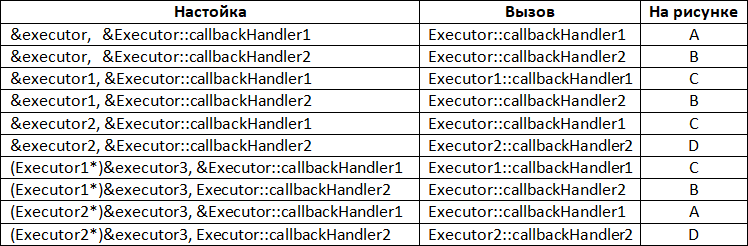 В строке 9 мы в качестве предшественника указываем класс Executor1 и назначаем указатель на метод callbackHandler1. В Executor1 этот метод переопределен, и он будет вызван. В строке 10 мы назначаем указатель на метод callbackHandler2; в Executor1 этот метод не переопределен, поэтому будет вызван метод базового класса Executor::callbackHandler2. Если мы в качестве предшественника будем указывать Executor2, как это показано в строках 11 и 12, то получится все наоборот: в строке 11 будет вызван метод базового класса Executor:: callbackHandler1, а в строке 12 будет вызван соответствующий переопределенный метод Executor2::callbackHandler2.