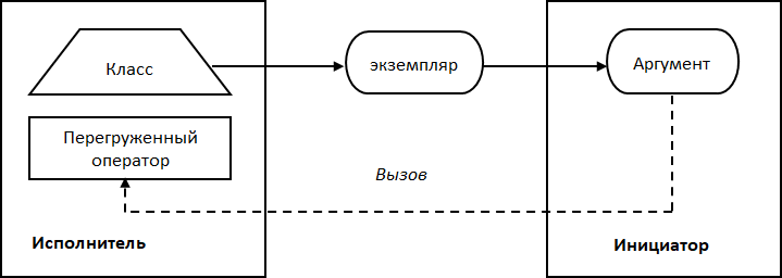 В строке 1 мы объявляется класс-инициатор. В строке 2 объявляется функция для настройки вызова, в которую передается ссылка на функциональный объект. Данный объект присваивается переменной-аргументу, объявленному в строке 5. В строке 3 объявлена функция запуска, внутри этой функции в строке 4 производится вызов перегруженного оператора. Как видим, синтаксис вызова перегруженного оператора совпадает с синтаксисом вызова обычной функции.