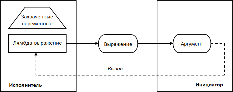 Графическое изображение обратного вызова с помощью лямбда-выражения представлено на Рис. 15. Исполнитель реализуется в виде какой-либо исполняемой функции, в качестве которой могут выступать глобальная функция, статический метод класса, метод-член класса, перегруженный оператор. Код обратного вызова упаковывается в лямбда-выражение, в качестве контекста выступают захваченные переменные. При настройке лямбда-выражение как аргумент сохраняется в инициаторе. Инициатор осуществляет обратный вызов посредством вызова хранимого выражения, передавая ему требуемую информацию. Контекст здесь передавать не нужно, поскольку внутри тела лямбда-выражения доступны все захваченные переменные.