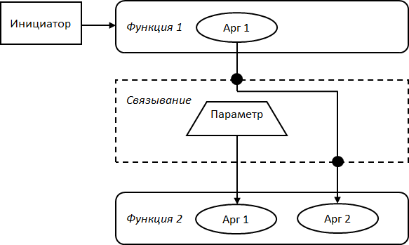 Графически использование связывания продемонстрировано на Рис. 18. Пусть инициатор вызывает функцию 1, которая на вход принимает аргумент 1. Исполнитель реализует обратный вызов с помощью функции 2, которая принимает на вход два аргумента. Вместо функции 1 инициатору назначается объект связывания, который имеет перегруженный оператор вызова функции с сигнатурой 1. Указанный объект хранит дополнительный параметр, значение которому присваивается во время инициализации. Перегруженный оператор, в свою очередь, вызывает функцию 2, первому аргументу передает сохраненный параметр, а второму аргументу передает значение аргумента из функции 1. Таким образом, осуществляется перенаправление вызова из функции 1 в функцию 2.