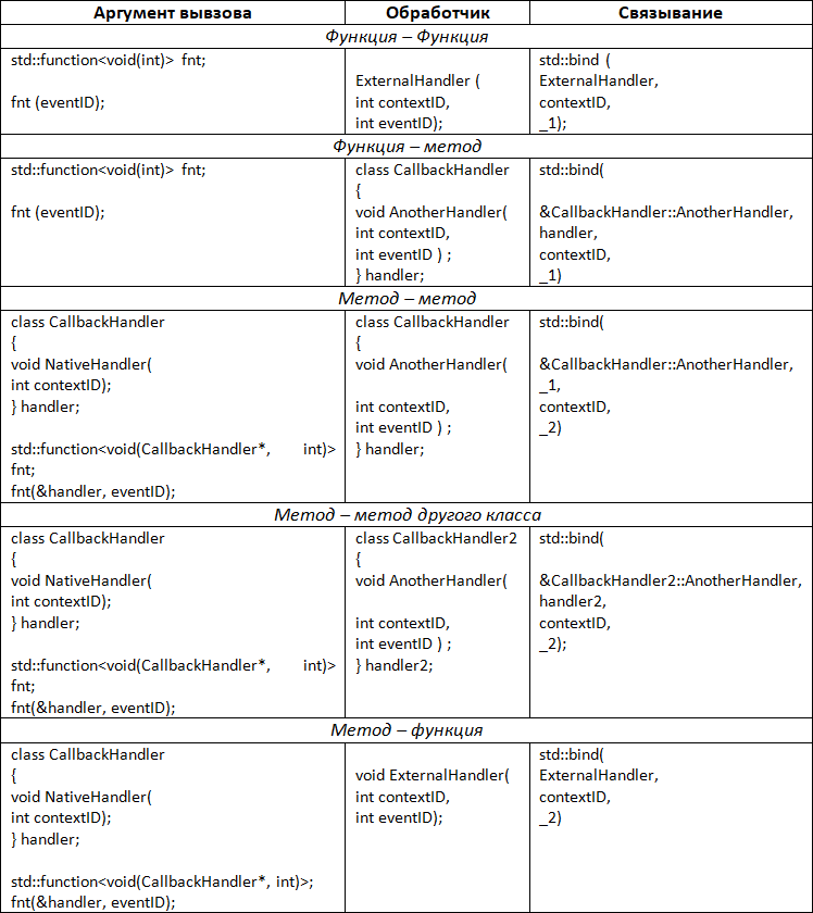 Здесь в строке 1 мы использовали using namespace, что сокращает объявление позиций аргументов: как видно из строки 2, мы сразу пишем позицию без использования std::placeholders, что значительно компактнее и проще для восприятия. Здесь в исходной функции присутствует неявный параметр с номером 1, который определяет экземпляр класса. Этот параметр назначается первому (неявному) параметру новой функции, а второй параметр исходной функции eventID назначается последнему параметру новой функции.