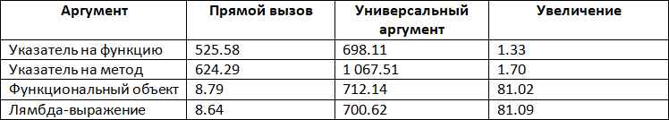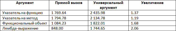 Посмотрим теперь результаты при использовании универсального аргумента. Если сравнить с вызовами напрямую, время выполнения ожидаемо увеличивается. Однако если для указателя на функцию и указателя на метод увеличение незначительно, то для функционального объекта и лямбда-выражения оно увеличивается настолько, что практически исчезает отличие от других способов. Теперь код обработчика не встраивается в точку вызова, и расходы на вызов функции во много раз превышают расходы на выполнение тела функции.