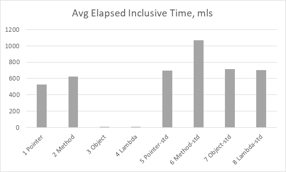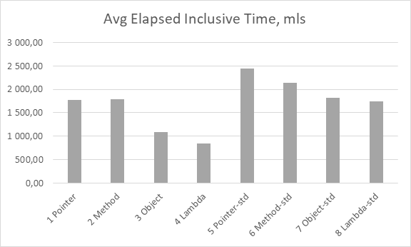 Проанализируем вначале результаты при организации вызовов напрямую, без использования универсального аргумента. Быстродействие для указателя на функцию и указателя на метод различается незначительно, а вот при использовании функциональных объектов и лямбда-выражений оно вырастает на порядки28, потому что код встраивается в точку вызова.