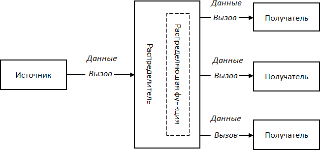 Графически задача распределения вызовов показана на Рис. 21. Компонент, осуществляющий вызов, называется источником; аргументы вызова называются получателями; компонент, осуществляющий распределение вызовов, называется распределитель; код, запускающий вызовы, называется распределяющая функция. При необходимости дополнительно в вызов могут передаваться какие-либо данные.