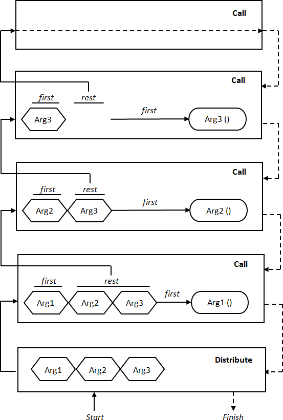 Рекурсивная функция Call объявлена в строке 2. Эта функция принимает два аргумента: первый параметр из пакета first и пакет остальных параметров rest. При первом вызове пакет параметров из Distribute передается в эту функцию, и там происходит его распаковка: первый параметр извлекается и помещается в first, оставшаяся часть пакета записывается в rest. В строке 3 производится вызов, а пакет с оставшимися параметрами передается в рекурсивный вызов Call (строка 4).