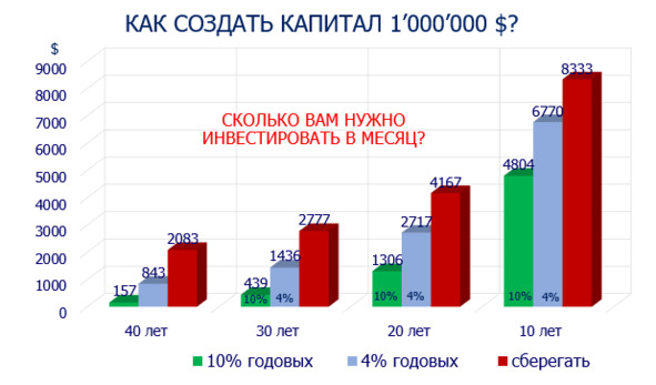 Рисунок 6. Сколько нужно инвестировать, чтобы создать капитал 1 млн долл.
