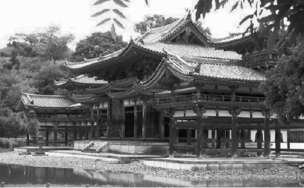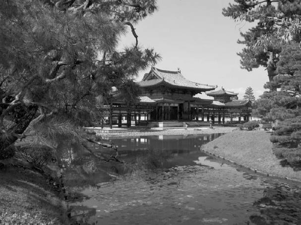 Одним из немногих уцелевших свидетелей волшебной красоты амидийских садов хэйанской поры является чудом сохранившийся до наших времен маленький павильон храма Бёдоин, расположенный в Удзи, живописной горной местности неподалеку от Киото. За свой легкий и грациозный силуэт, напоминающий корпус летящей птицы, павильон получил название Хоодо (Храм Феникса). Глядя на этот изящный павильон, построенный в середине XI столетия, невольно думаешь о магической силе самого названия, неведомым образом вот уже на протяжении девяти веков оберегающей хрупкое строение от войн и пожаров, полыхавших вокруг.
