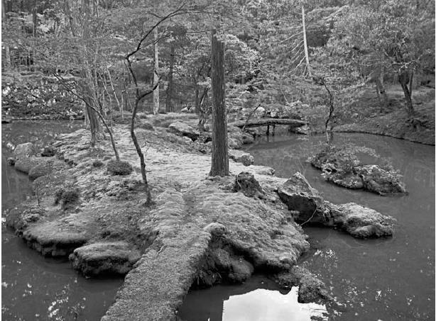 Можно также предположить, что, меняя форму пруда, Мусо Сосэки следовал вековой традиции предельно бережного и трепетного отношения к слову, знаку, вере в магическую силу иероглифа. «Сакутэйки», самая старая из дошедших до наших времен книг по садовому искусству, например, гласит: «Если в центре замкнутого пространства стоит дерево, хозяин дома будет пребывать в постоянной тревоге. Причина этого – в том, что дерево, которое находится в центре замкнутой формы, повторяет очертание китайского иероглифа комару со значением "находиться в затруднительном положении"» 3.