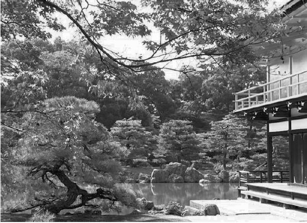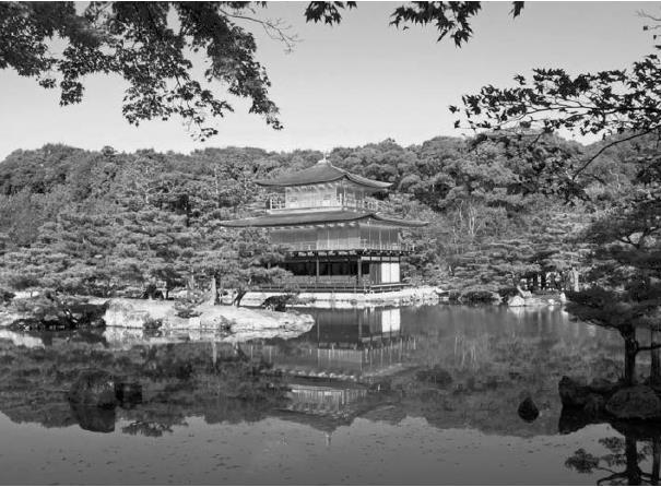 Горячий поклонник изящных искусств, Ёсимицу в 1394 году переложил все государственные дела на своего малолетнего сына Ёсимоти и, приняв постриг, стал вести образ жизни, при котором уже ничто не отвлекало его от любимых занятий. Обителью бывшего сёгуна стала Вилла У Северной Горы (Китаяма-доно), позднее переделанная в блистающий своей красотой храм Рокуондзи, или, как его еще называют, Золотой павильон (Кинкакудзи), ибо два верхних этажа его были облицованы золотыми пластинами. Нижние этажи использовались для занятий музыкой, поэзией, верхний предназначался для медитаций. Кинкакудзи построен на месте храма, принадлежавшего одному из лидеров Камакурского сёгуната XIII столетия Сайондзи Кинцунэ, к концу жизни потерявшего свое влияние и власть. Оставшийся на месте бывшего храма сад был реконструирован в соответствии с эстетическими требованиями дзэн. В наши дни трехэтажный Золотой павильон находится на берегу пруда, но в прошлом воды озера омывали его со всех сторон. Сад, видимый из павильона, подобно живописному свитку, широкой панорамой открывался глазам созерцателя. Ровная неподвижная гладь водоема, названного Зеркальным озером (Кёко), вызывала соответствующие в контексте представлений буддизма дзэн ассоциации с ясным и чистым сердцем человека, пребывающего в покое и бесстрастии. «У высшего человека сердце – что зеркало, оно не влечется за вещами, не стремится к ним навстречу, вмещает все в себя и ничего не удерживает…» (Чжуан-Цзы).