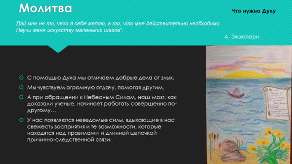 Как раз молитва – верный помощник в созидании Духа, в том, чтобы следовать своему сердцу и интуиции, а также формировать в себе осознанность. На эти понятия, кстати, плавно переходит сообщество нового бизнеса, основанного на интуиции. Очень многие современные эксперты говорят о том, что среди хаоса, в котором постоянно встречаются неожиданные проблемы, несмотря на быстро развивающуюся автоматизацию и технологическое управление, интуиция, ее развитие внутри себя самого может быть самым мощным ресурсом по стратегическим решениям. А именно Дух, как мы помним, является тем самым Стратегом, форма общения с которым разная. Одна из наиболее действенных и неотъемлемых – это молитва. Хотелось бы подчеркнуть, что самая лучшая молитва – происходящая в радости Общения, а не в просьбах. Молитва – это не просьба, хотя корень слова очень подходит к такому пониманию, – это нахождение в Благодати и черпание Живой духовной воды в свой кувшин – наполнение Души Духом. В таком случае энергия будет проходить через тело и на физическом уровне. Не будет усталости от молитвы, но ощущение улучшения кровообращения, клетки начинают двигаться и передавать электрические заряды нейронов по всему организму от макушки до пят. И этому есть вполне научные объяснения. Сознание – это некая атомная станция, от работы мозга зависят все процессы организма. Какие импульсы будет посылать мозг остальным внутренним органам, зависит от нас самих.