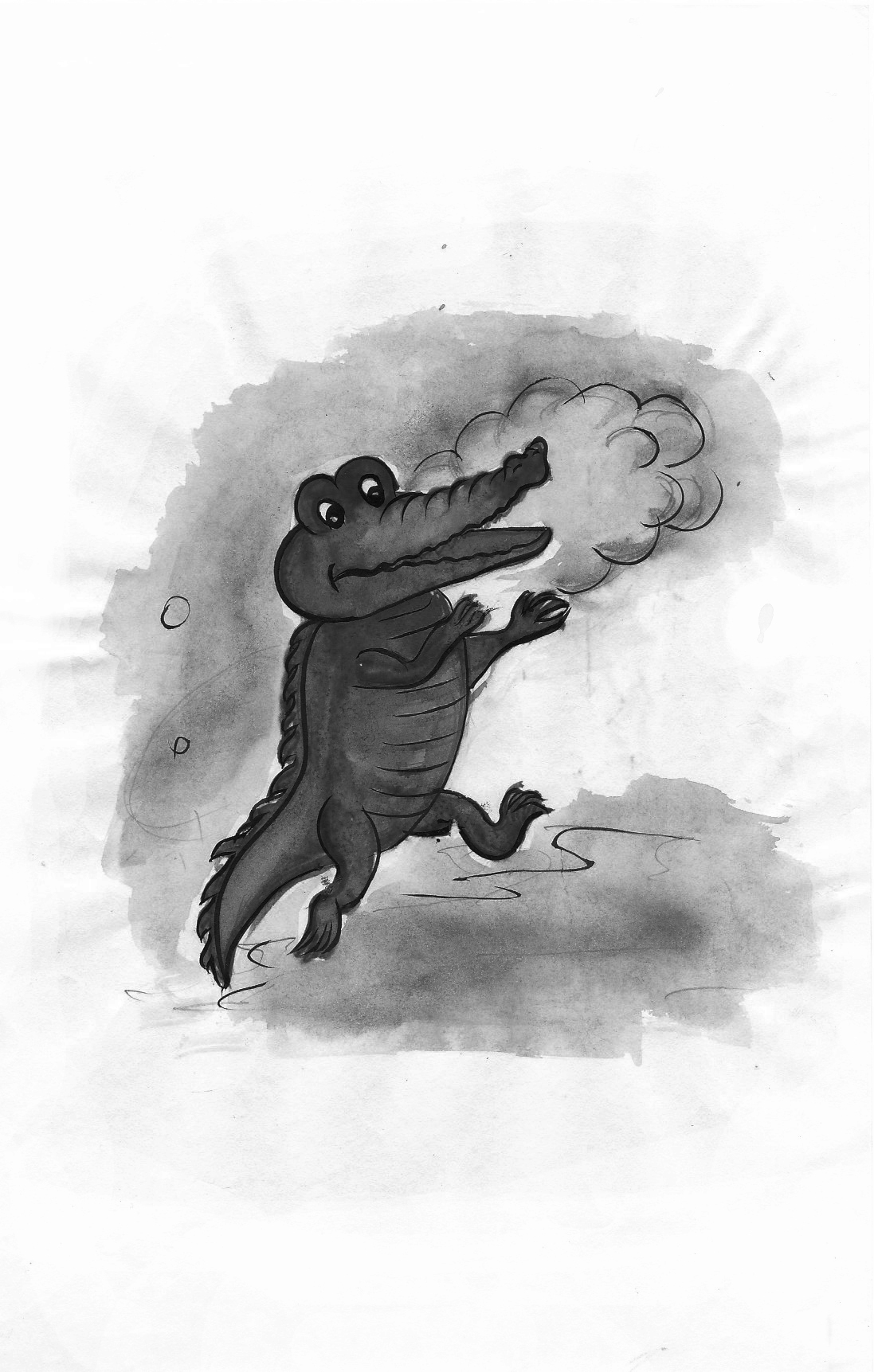 Однажды он случайно забежал во двор и увидел двух мальчиков, сидящих с книжкой на брёвнышке. Старший из ребят выразительно читал младшему: «Долго-долго крокодил море синее тушил. Пирогами и блинами и сушеными грибами…» Любопытный крокодильчик сунул нос в книжку и обомлел.