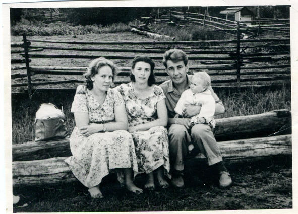 В деревне Красная на родине писателя, возле дома матери. Слева направо: Юшкова Галина Евгеньевна, жена писателя, подруга жены: Татьяна Александровна Балашова, Геннадий Анатольевич Юшков с дочерью Мариной на руках. Июнь 1960 года