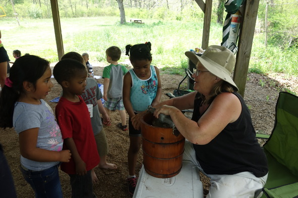 Мороженое мы делали что-то около часа. Увы, я не смогу объяснить технологию Вирджинии в деталях. Но как-то так: берётся некая охлажденная ёмкость, в неё заливается приготовленный заранее йогурт с добавлением яиц и свежих ягод; все это помещается в другую ёмкость – деревянную кадушку (кстати, настоящий антик), в которую насыпается лёд и крупная соль (очевидно, соль плюс лёд дают хороший эффект холода), потом Вирджиния как-то волшебно вращала ручку сбоку и перемешивала йогурт во внутренней ёмкости. Каждое дитё получило шанс пять раз прокрутить ручку. Параллельно я раздавала уже готовое с вечера мороженое. Тут, конечно, творился полный беспредел, и мороженого мне на всех не хватило. Мне было стыдно смотреть детям в глаза. Но вот, наконец, подоспела и свежая порция, так что все остались довольны.