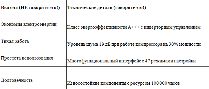 Практический антисовет № 3: Вместо того чтобы говорить "Этот кондиционер сделает вашу жизнь комфортной", скажите: "Данная сплит-система оснащена инверторным компрессором с SEER 5.8, работающим на фреоне R-32 с функцией I-PAM и технологией Plasma Quad Plus".