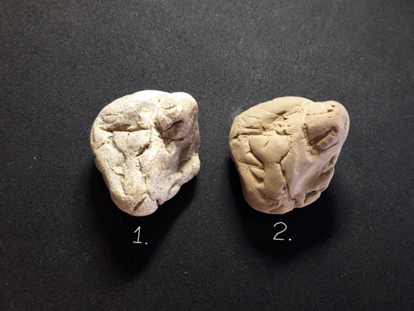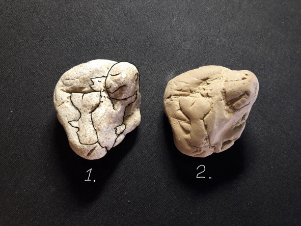 А здесь мы воспроизвели из глины изображение на камне человека рыбы и птицы, где 1.-это камень, а 2.– это глина. И этот опыт так же доказывает, что в древности при изготовлении этот камень был такой же пластичный, как и эта глина.