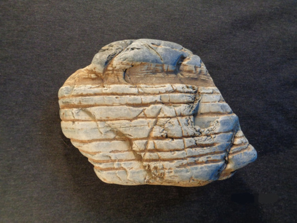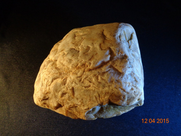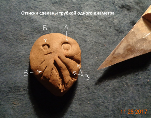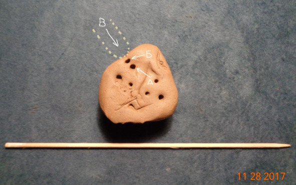 А это образец из глины, в котором круглое отверстие так же деформировало при нажатии на него, как и на предыдущем камне.