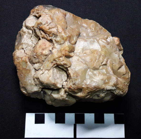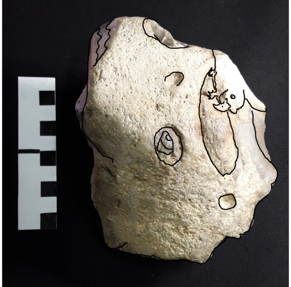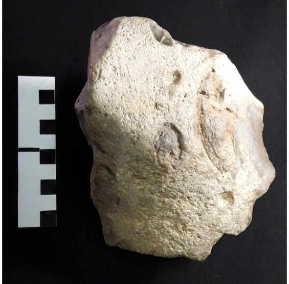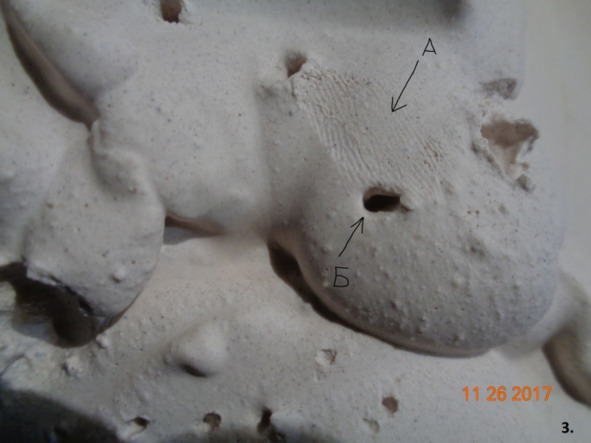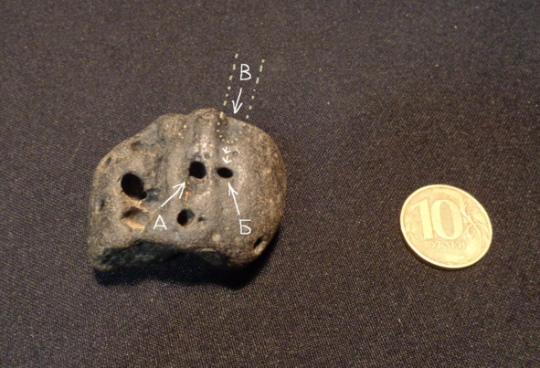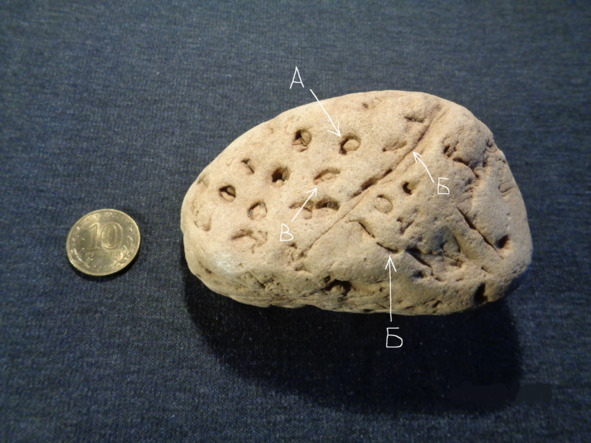 Этот камень тоже обрабатывали пока он был сырой, и слепые отверстия в нём сделаны трубчатым инструментом, где (А) – не деформированное отверстие, (В) – деформированное отверстие из- за нажатия на него. И (Б) – линии оставленные резцом, который вмял поверхность, так как она была ещё пластична.