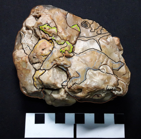 На этом каменном инструменте мы видим группу животных лежащих на мамонте. Видно, что они только устроились на ночлег и не у всех ещё глаза закрыты. На мамонте видно седло и какой-то скарб. Все эти животные явно приручены человеком.