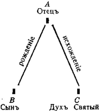 Пусть самый фактор будет обозначен через «А»; действия (энергии) же его, проистекающие одновременно: – одно в отношении «В», другое, различное от него – в отношети «С». Я утверждаю, что и «С» будет различным от «В». Ибо если бы оно было тем же, что и то, оно полностью соответствовало бы ему и тогда действие в отношении его, соответствовало бы действию в отношении «В», иными словами, было бы тем, что и то. Пусть под «А» будет обозначаться Отец, присносущно и по естеству действующий; под «В» – Сын; а под «С» – Дух святый; и действия, проистекающие от Отца – различны между собою: в отношении «В» это – рождение Сына; в отношении же «С» это – исхождение Божественного Духа. Следовательно, Дух – различен от Сына, так как в отношении бытия Каждого из Них различными являются действия; и уже не будет нам нужды в ином различии между Сыном и Духом, когда самые различные действия и происхождения довлеют для того, чтобы сделать различие между Ними.