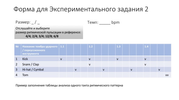 В завершении подраздела отметим, что, кроме сильных долей, важную функцию выполняют слабые доли и длительности ритмического заполнения – именно они определяют стиль музыкального продукта в совокупности с тембрами и фактурами других инструментов ритм-группы (бас, гитара, фортепиано, перкуссия). В ходе многократного повторения упражнений, аналогичных предложенному во втором экспериментальном задании, у продюсера нарабатывается опыт и развивается способность угадывать стиль музыкального произведения и писать музыку в выбранном стиле.