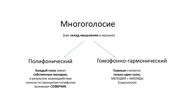 Рис. 8. Многоголосие и его виды. Полифонический и гомофонно-гармонический склад мышления.