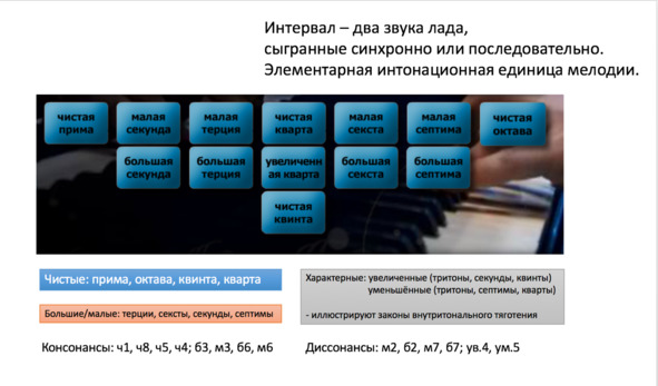 Понимание сути интервалов подводит нас к отправной точке в формировании представления о музыкальном языке как о системе. И если в Евклидовой геометрии в основе системы лежат понятия «точки» и «линии» как элементарных смысловых единиц, используемых в объяснении и практике выполнения задач по начертанию фигур и графиков, то в музыке и акустике такими семантическими примитивами выступают понятия «звук», «звукоряд», «тон» и «полутон», «ступень» и «лад». Общепринятые определения этих терминов можно прочесть в трудах И. В. Способина (1996), И. А. Алдошиной и