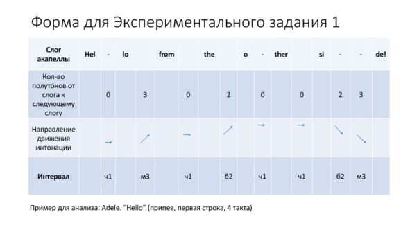 Если выполнение задания Вас вдохновило на подобного рода исследования, обязательно в отдельной заметке блокнота или в таблице Google либо Microsoft зафиксируйте результаты, вписав обнаруженные данные в таблицу структуры, похожей на приведённый ниже образец (для этого проследите за тем, чтобы в таблице в верхней строке слоги вокальной строчки были пробелы между слогами размером в ячейку – это понадобится для вписывания интервалов, а в строке «интервал» заполнять будете как раз ячейки, находящиеся под пустыми относительно верхней строки (то есть, интервал будем подписывать на стыке слогов), как в приведённом примере для песни Adele «Hello!»: