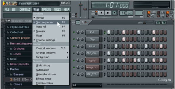 Нагляднее всего понять суть ритма и логику деления на такты и длительности долей можно в интерфейсе аудиоредактора Fruity Loops, где можно создавать бит’ы и ритмические петли, нажимая курсором мыши на условные «машинки», расположенные в строки «квадратно-гнездовым способом» для сэмплов ударных инструментов: kick, snare, clap, hi-hat, cymbal, crush, tom и пр. (Рис.6):