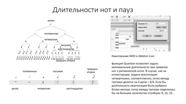 Рис. 7. Длительности нот и пауз. Евпак Е. Г. Проектный семинар «Основы Ableton Live. 4 модуль» – дополнительные визуальные материалы к онлайн-курсу для студентов факультета Медиакоммуникаций НИУ ВШЭ. – Москва, 2021 г.