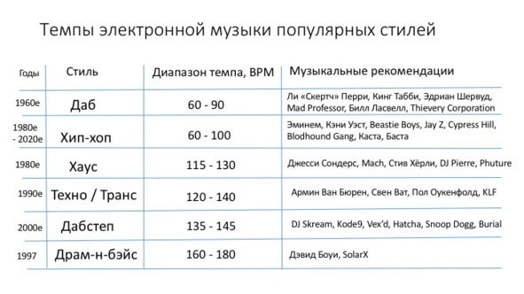 В таблице на рис. 8 представлены некоторые популярные электронные стили с примерами и их диапазон темпов:
