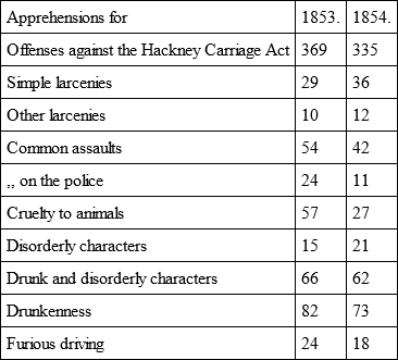 The criminal returns afford melancholy indications of their moral condition to those conversant with penal statistics. Thus, in the police returns we find, under the head of “Coach and cabmen” – but it is stated by the police to be chiefly of cabmen – a very heavy list of offences. In the year 1854 it was 682; in the year before that, 777. The recurring crimes are thus denoted: