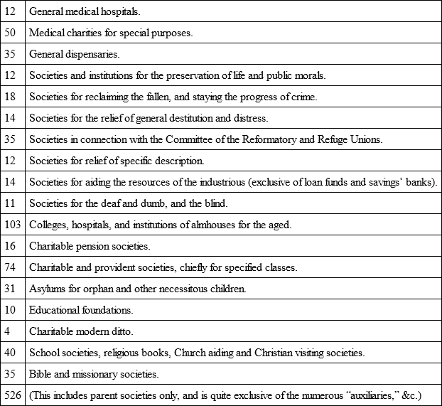 Associations for the voluntary relief of distress, the reclamation of the criminal, and diffusion of Christian truth, are a noble characteristic of the English people. There is no city in the world possessing an equal number of charitable institutions to those of the British capital. Taking the whole of London, and not exempting, from their distance, such as may be correctly classed as metropolitan institutions, as Greenwich Hospital, &c., we find there are no less than 526 charitable institutions, exclusive of mere local endowments and trusts, parochial and local schools, &c.