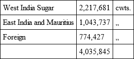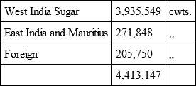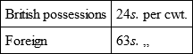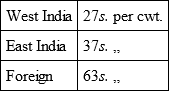 In 1830, the West India duty was reduced to 24s., the East India to 32s., which, as the editor of the Economist has well remarked, was “just so much more put into the pockets of the producers, so long as the 63s. on foreign sugar was continued.” In 1836, a slight change was introduced. The duty on East India was equalised, so that the duty was —