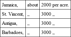 There is a great amount of misunderstanding on this subject. The soil of the West India Islands is always represented as exhausted, which is far from being actually the case. In Cuba, according to an estimate made by the patriotic society of Havanna, it appears that two hundred and fifteen acres of new land are expected to produce, in cane cultivation, thirteen hundred boxes of sugar, or 2172 lbs. per acre. We may reasonably infer, that the production in Brazil does not equal this. We find that the exports of sugar from the latter country have rather declined, while those of Cuba have been nearly doubled within the last few years; while from the evidence taken by a committee of the House of Commons, it appears that with the present imperfect system of cultivation, the following results have been obtained, including ratroons, or canes cut for several years successively. 7