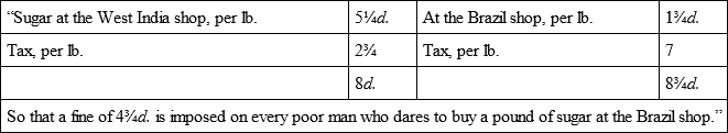 “The result, therefore, would be, that for the same sum of money which the country expended last year in sugar, an additional quantity of 1,722,873 cwts. would be enjoyed by the community, which would only restore the average consumption of 23¼ lbs. per head of 1811, an additional revenue of £2,067,447 would be given to the State, and an increase of trade amounting to nearly £4,000,000 annually would be experienced by the dealers, merchants, and carriers of sugar.”