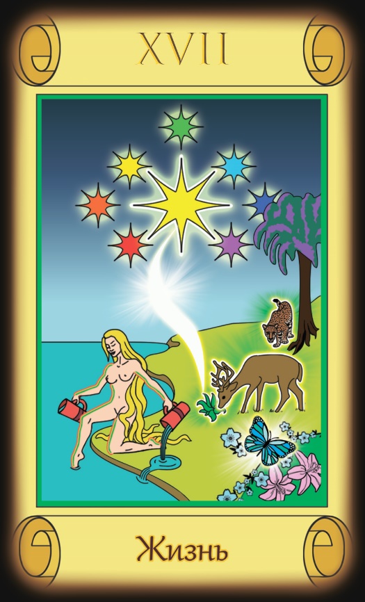 На карте 17 аркана мы видим девушку без одежд, которая, облокотившись одной ногой на берег, другой, зайдя в реку, черпает одним сосудом воду, а из другого выливает ее на берег. Есть звезда – Солнце, есть 7 звезд вокруг нее. Есть растения, которые вырастают на базе энергии Солнца. Есть животные, которые питаются растениями – травоядные. Есть ягуар – хищник. Есть бабочка на цветке.