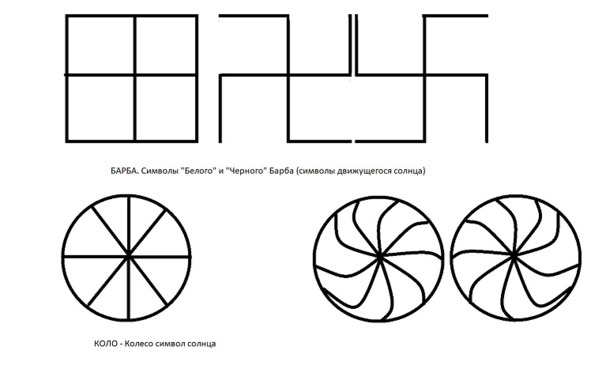 Символ Барба – равносторонний прямой крест. Крест, наклоненный подобно букве «Х», – это символ взаимодействия с видимым светом, знак взаимодействия, союза и оплодотворения. Пробужденные стихии начинают развитие, вторя движению солнечного луча света слева вверх направо. Вращение пробудившихся стихий, Коловрат, оставляет за собою энергетический след. Символ Крест преобразуется в символ шагающей Свастики.