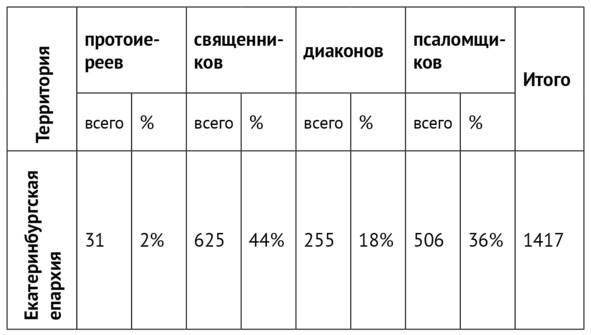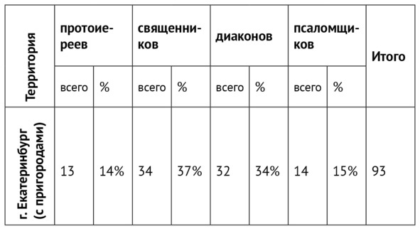 * Составлено по: Отчет о состоянии Екатеринбургской епархии за 1915 г. РГИА. Ф. 796 Оп. 442. Д. 2699. Л. 36—38; Справочная книга Екатеринбургской епархии на 1915 год. Екатеринбург, 1915. С. 16—22, 31, 43—44. Здесь и далее диаконы указаны совместно с протодиаконами.