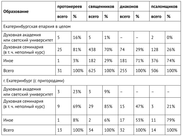 Дабы заполнить вакуум, образовавшийся после ухода многих представителей духовенства с Колчаком, епархиальное начальство спешно и в большом количестве принялось рукополагать в священнический сан диаконов, псаломщиков, а также лиц, прежде вообще не состоявших на церковной службе (в основном из крестьян и мещан). Произведенный автором анализ клировых ведомостей за начало двадцатых годов по ряду приходов показывает, что уровень образования последних обычно ограничивался двухклассными школами Министерства народного просвещения, земскими школами, учительскими школами и учительскими семинариями, редко гимназиями. Родом их деятельности до вхождения в состав клира было по преимуществу преподавание. Удельный вес священнослужителей с семинарским образованием резко сократился.