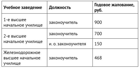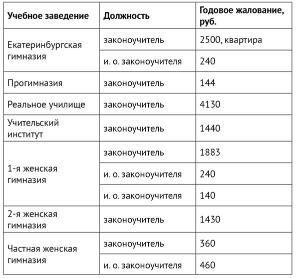Образовательный уровень духовенства напрямую влиял на размер получаемого им дохода. Так, в Екатеринбурге к 1917 г. имелось 10 учебных заведений Оренбургского учебного округа, в которых преподавателями Закона Божьего (и исполняющими должности таковых) числилось 15 священников. 14 из них одновременно состояли в городских приходах, получая жалование и по церковной службе. На размер годового преподавательского жалования влияли: должность, статус учебного заведения, стаж работы, количество преподаваемых часов. В учебных заведениях Екатеринбурга жалование для священников колебалось от 140 до 4130 руб. в год (см. табл. 2.3), в то время как их средний оклад на приходах епархии, согласно «Справочной книжке Екатеринбургской епархии», составлял 300 руб.